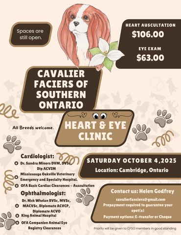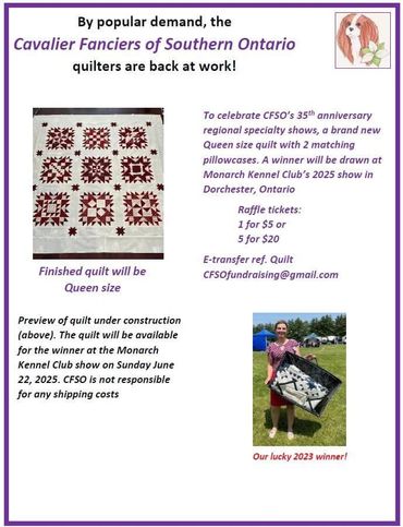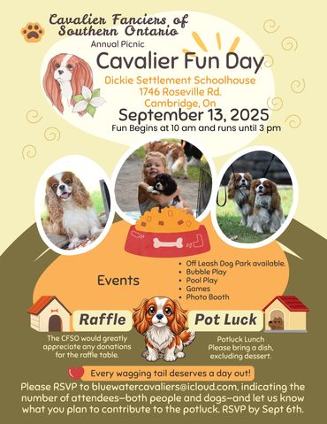 The Cavalier Fanciers of Southern Ontario (CFSO) warmly invite you to join us in celebrating our 35th Anniversary Specialty Shows! The specialties will be held in conjunction with the Monarch Kennel Club's All-Breed Shows and will feature two boosters, which will be judged by breed specialist Wendy Maisey (Dawnaquinn) and toy specialist Sandra Lex.